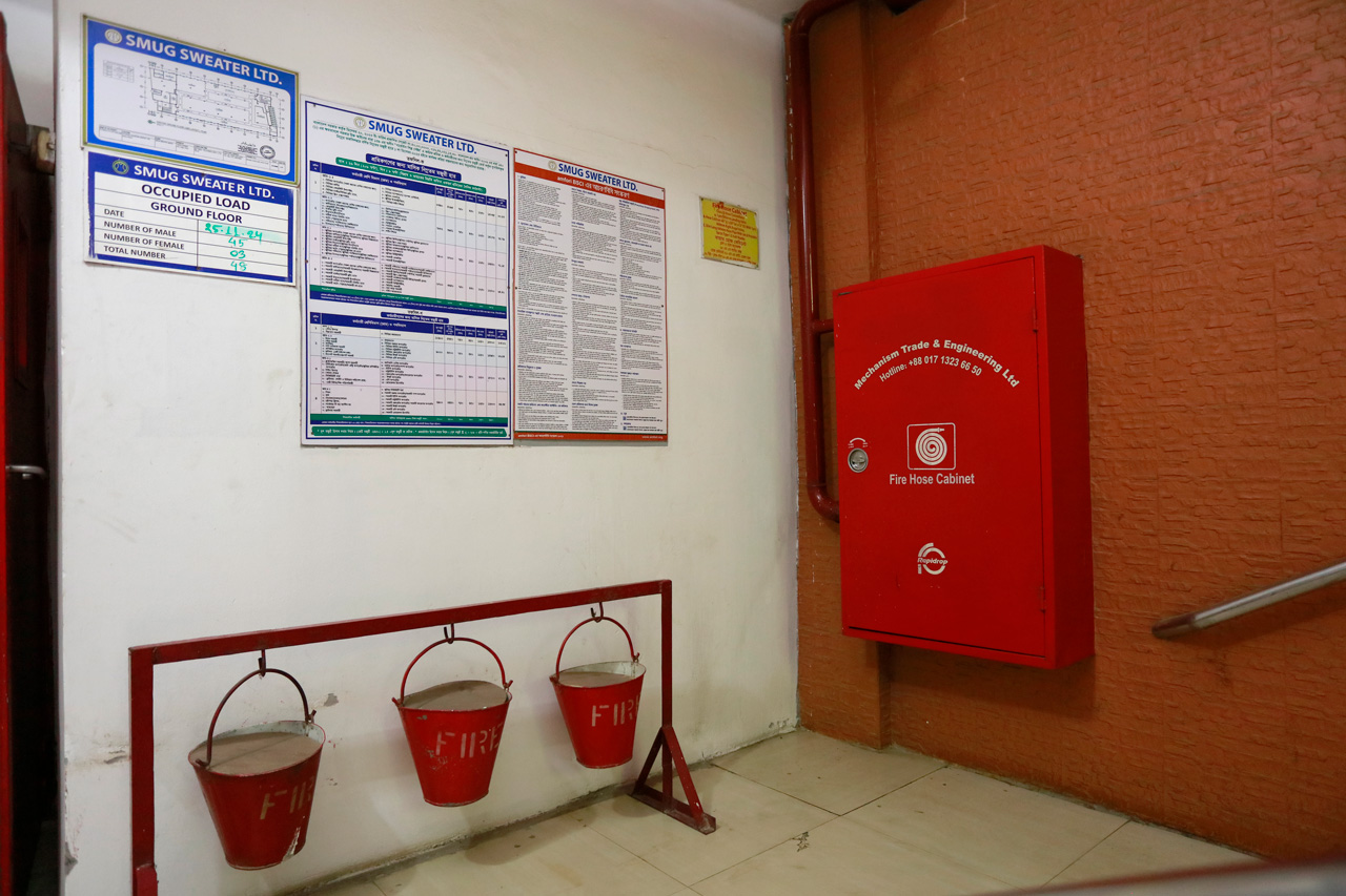As per floor area enough different types/size portable fire extinguishers have been placed and defined by special mark and easily located while in emergency. There are sufficient fire fighters and rescue team in every floor. There is a fire / emergency evacuation plan with symbols fixed in easily visible place of every production floor.
